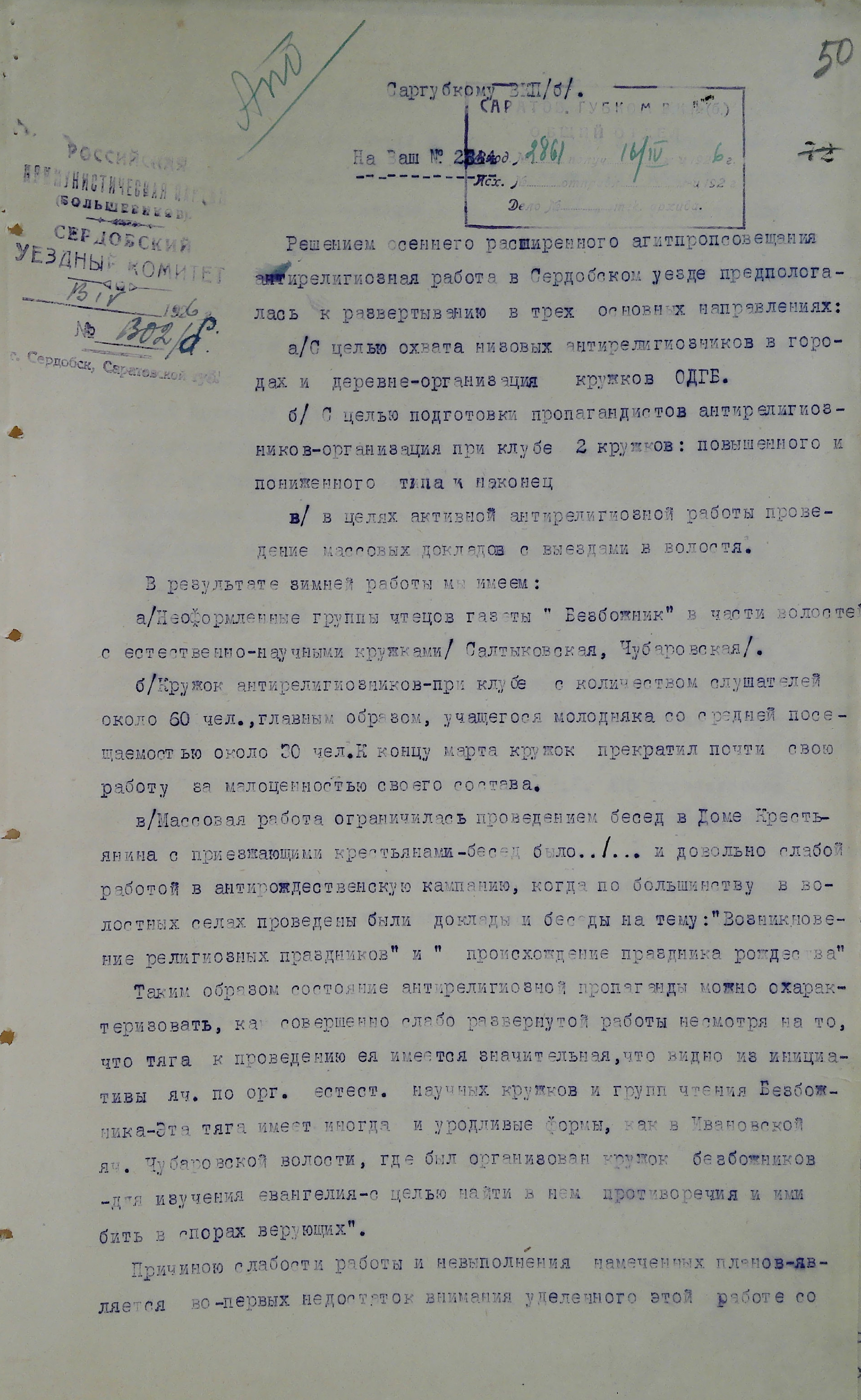 Сообщение Сердобского уездного комитета ВКП(б) Саратовскому губкому ВКП(б) об основных направлениях антирелигиозной работы и трудностях с её организацией.