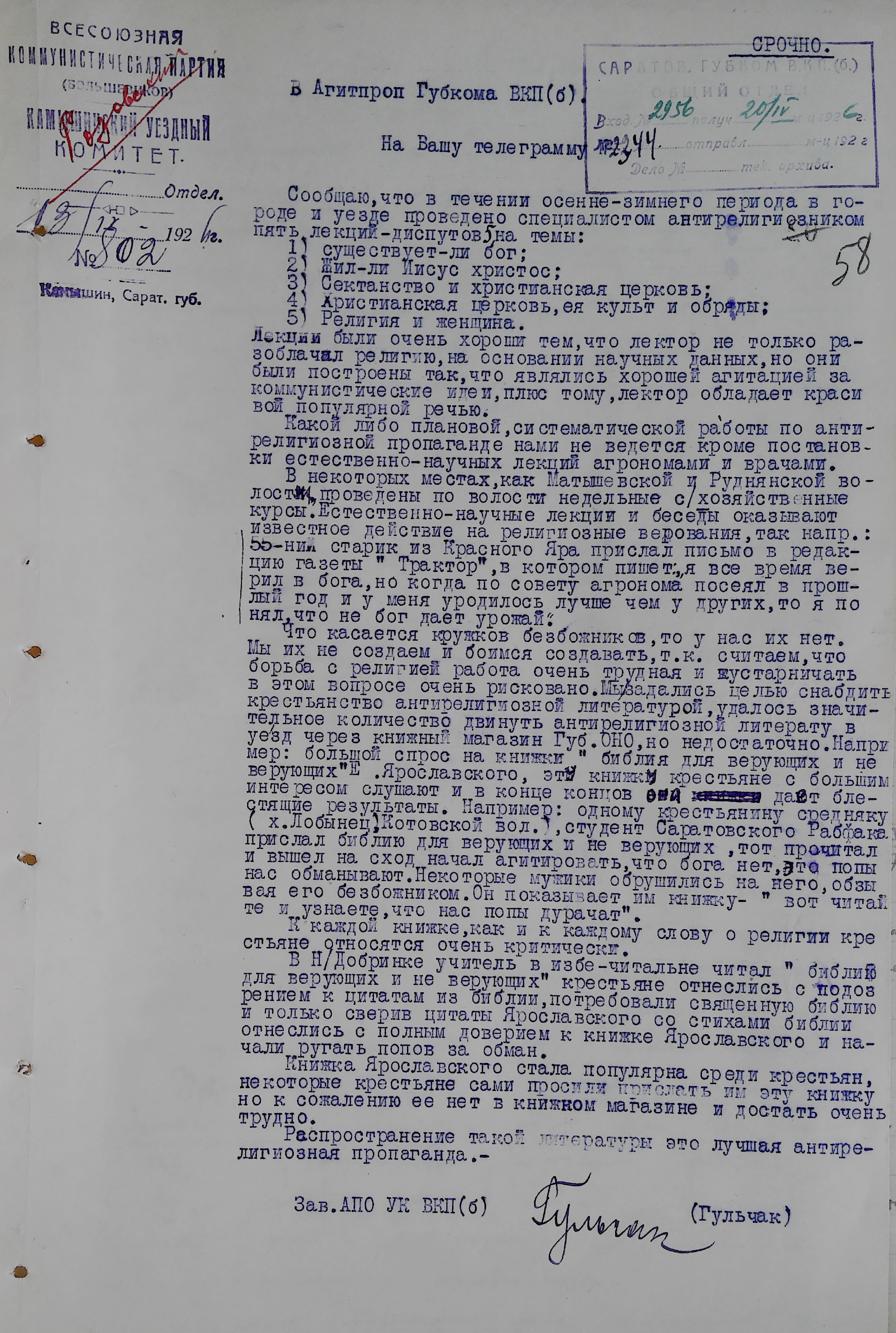 Сообщение Камышинского уездного комитета ВКП(б) Саратовскому губкому ВКП(б) об антирелигиозной пропаганде среди местных крестьян.