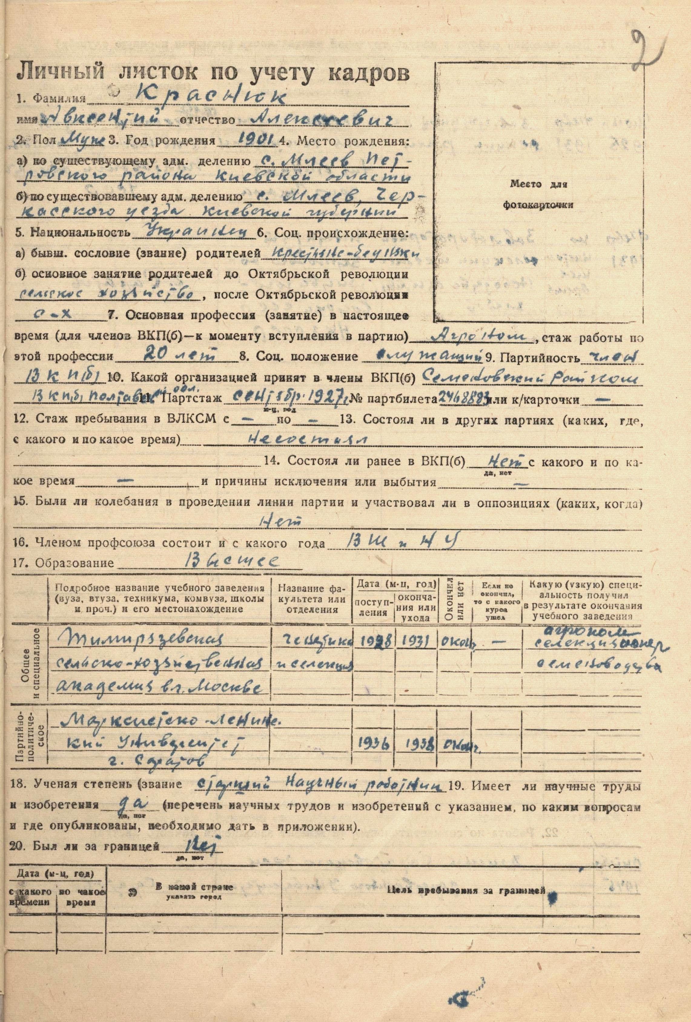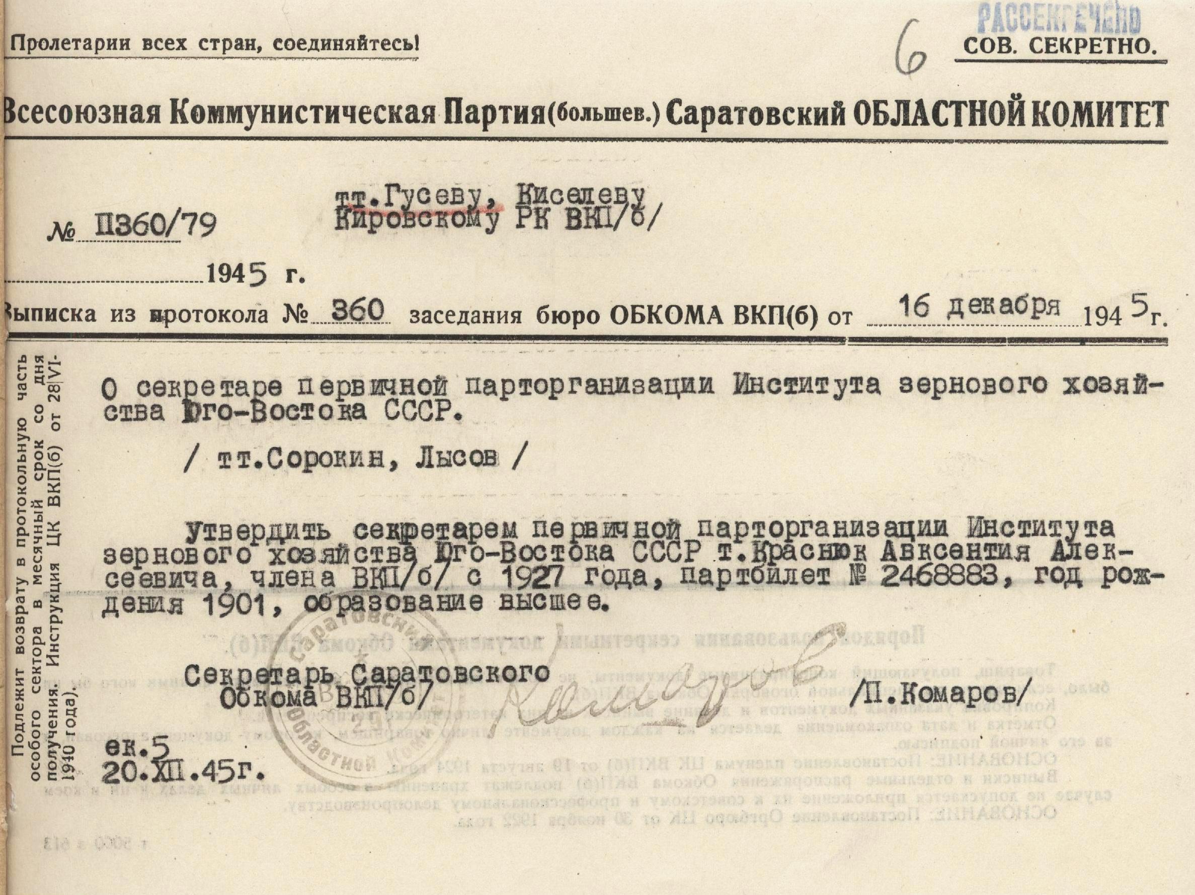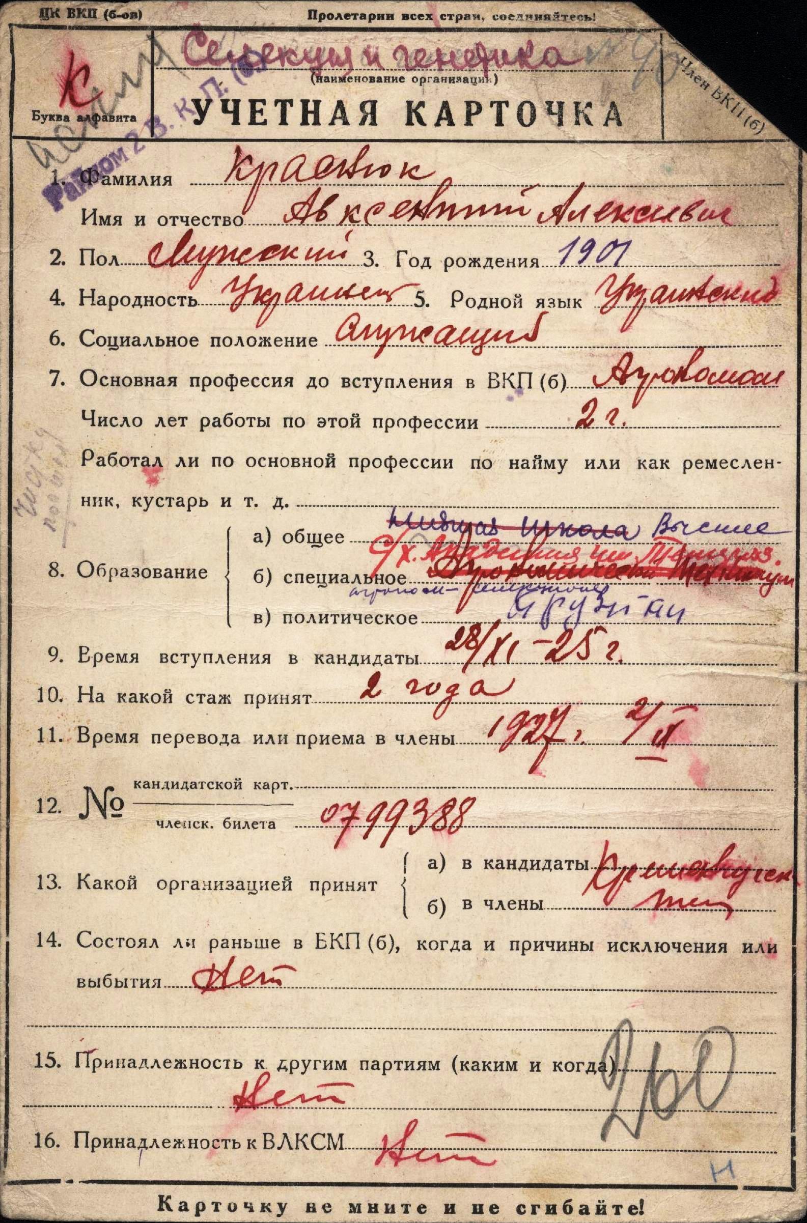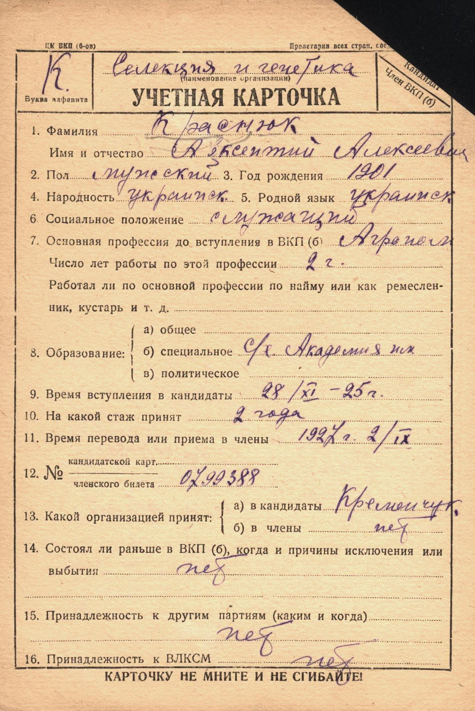 Авксентий Алексеевич являлся членом ВКП(б) с 1927 года. В ОГУ ГАНИСО выявлено личное дело номенклатурного работника (начато – декабрь 1945 г.; окончено – октябрь 1947 г.) и учетная карточка члена ВКП(б) (образца 1926 г.) Краснюка Авксентия Алексеевича.