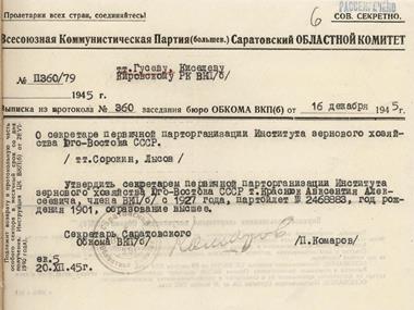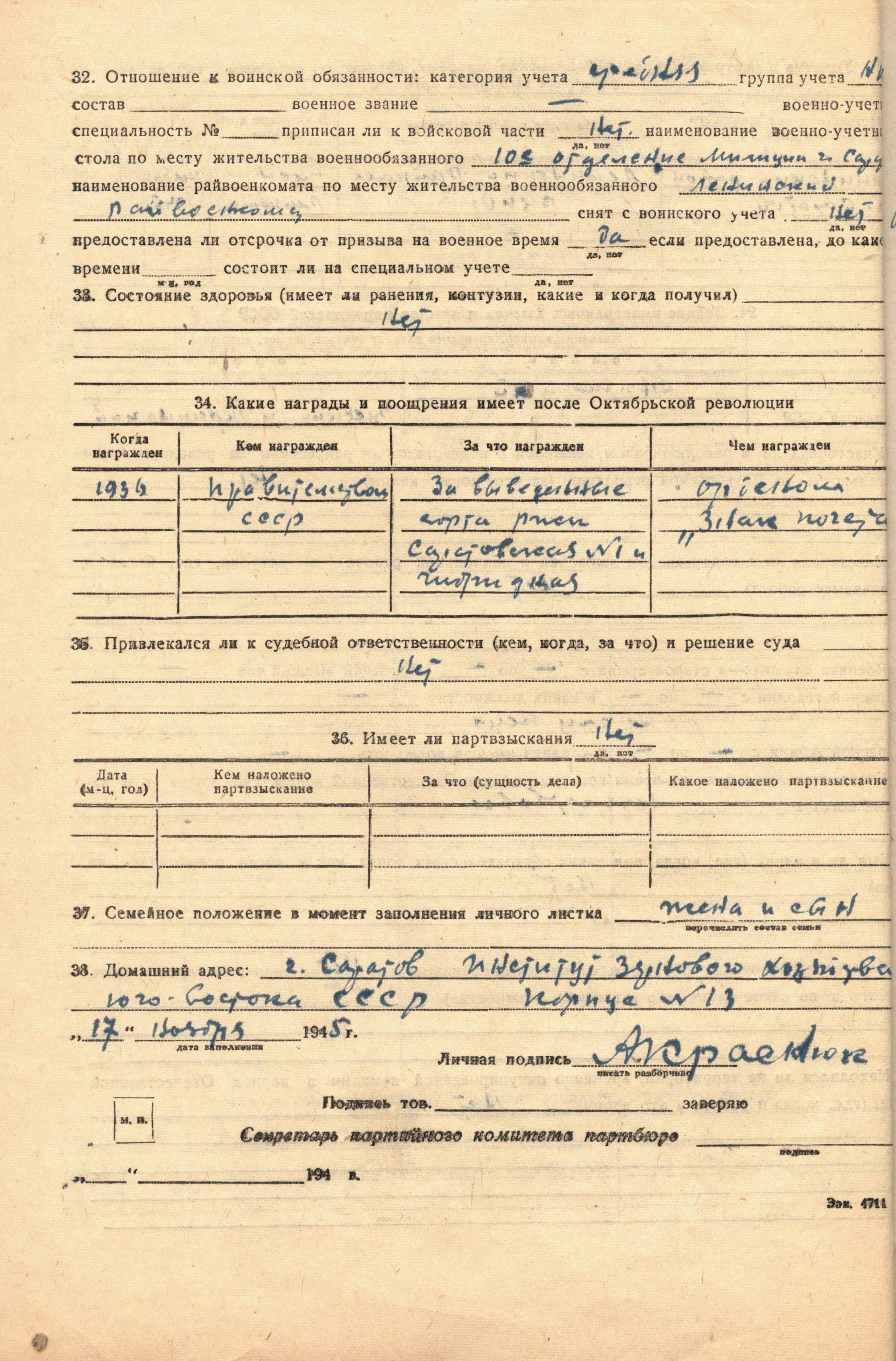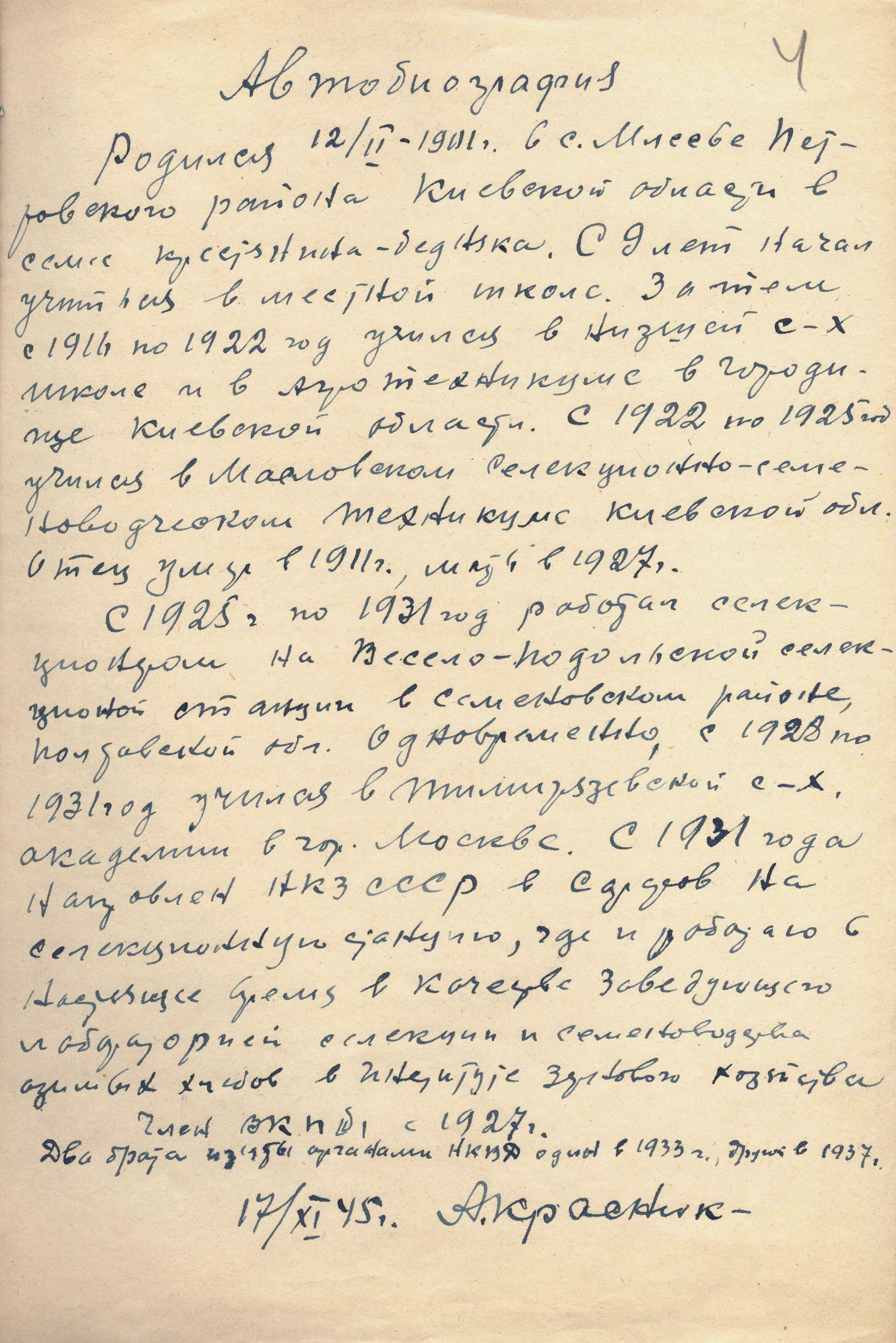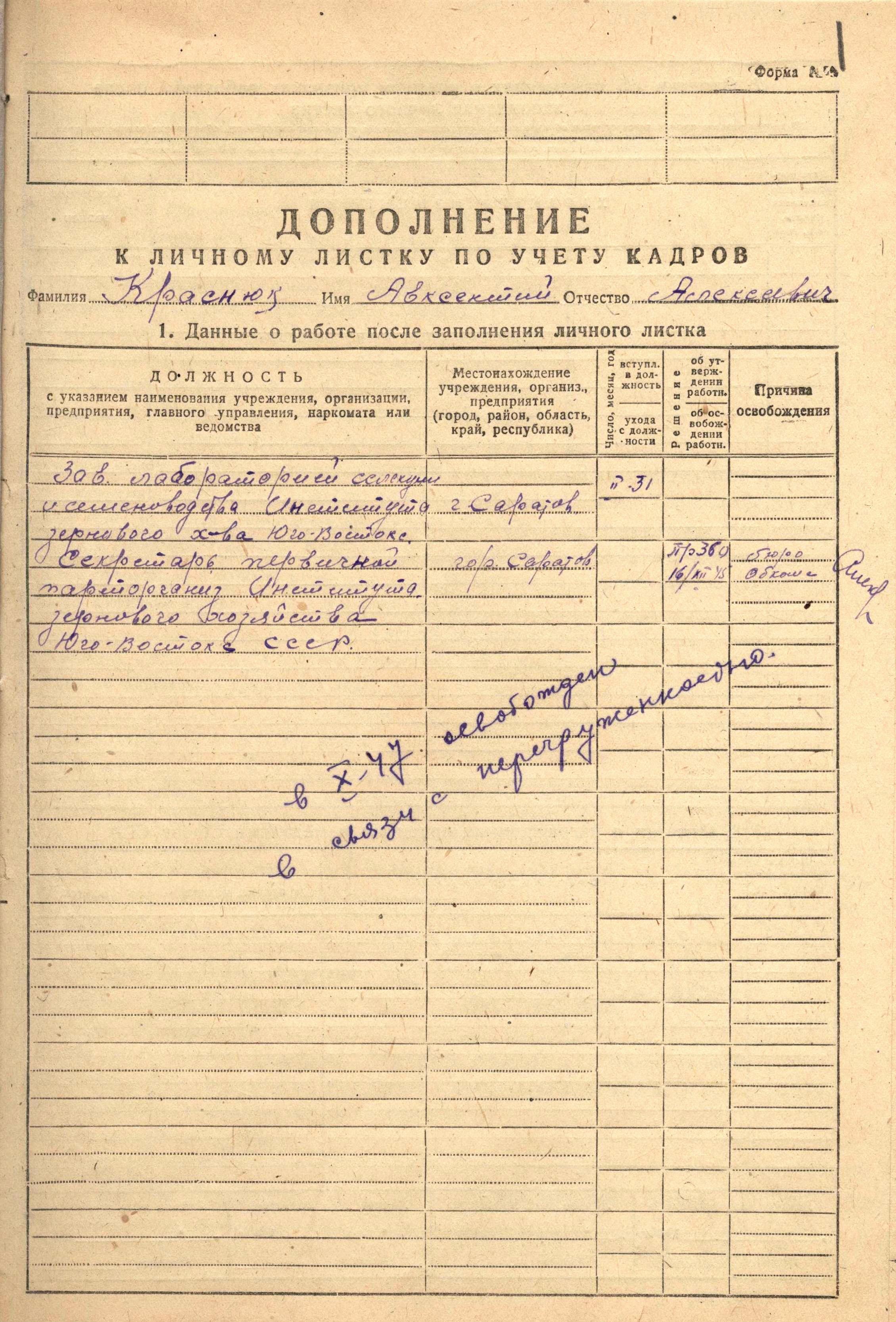 Авксентий Алексеевич являлся членом ВКП(б) с 1927 года. В ОГУ ГАНИСО выявлено личное дело номенклатурного работника (начато – декабрь 1945 г.; окончено – октябрь 1947 г.) и учетная карточка члена ВКП(б) (образца 1926 г.) Краснюка Авксентия Алексеевича.