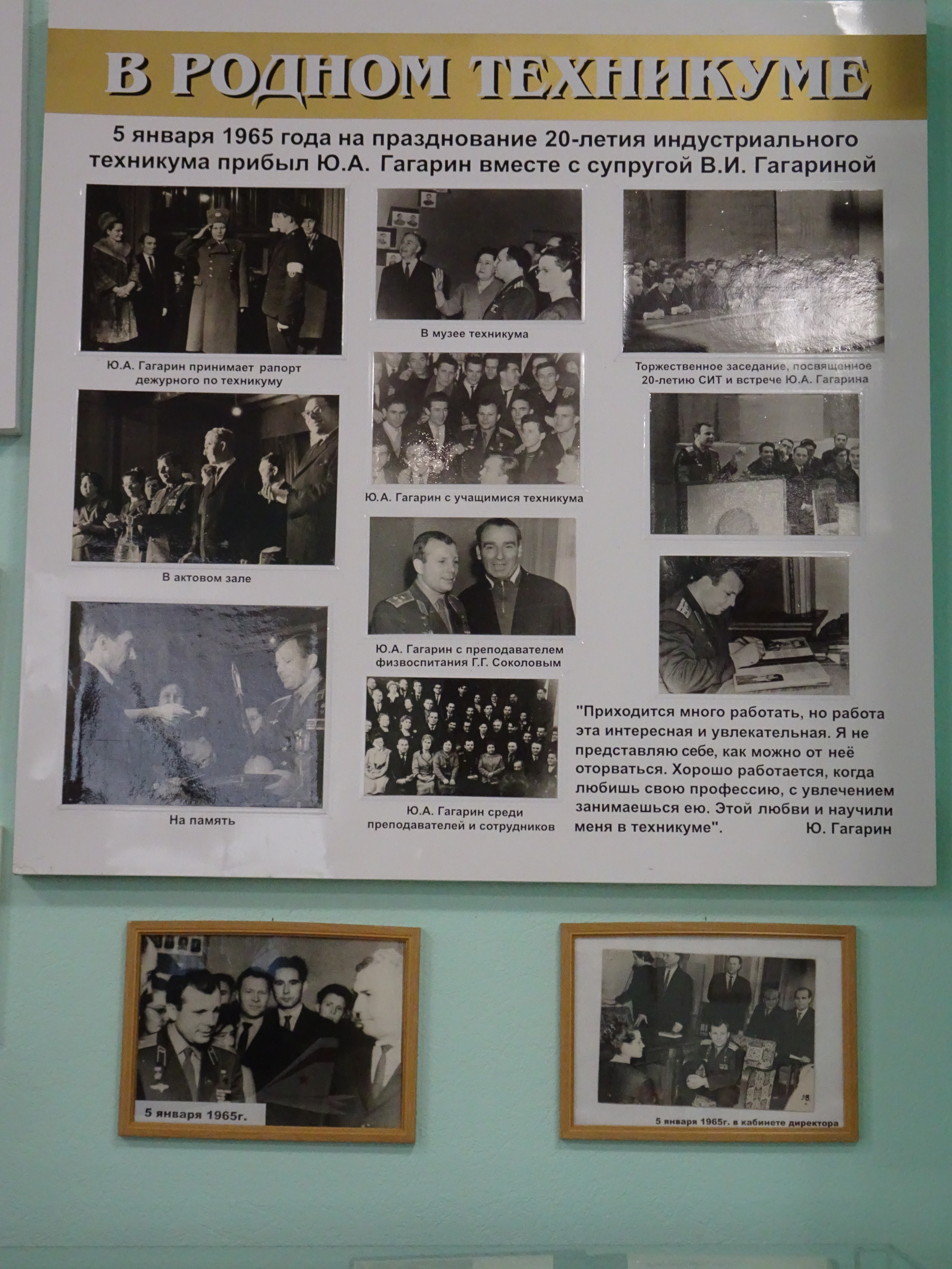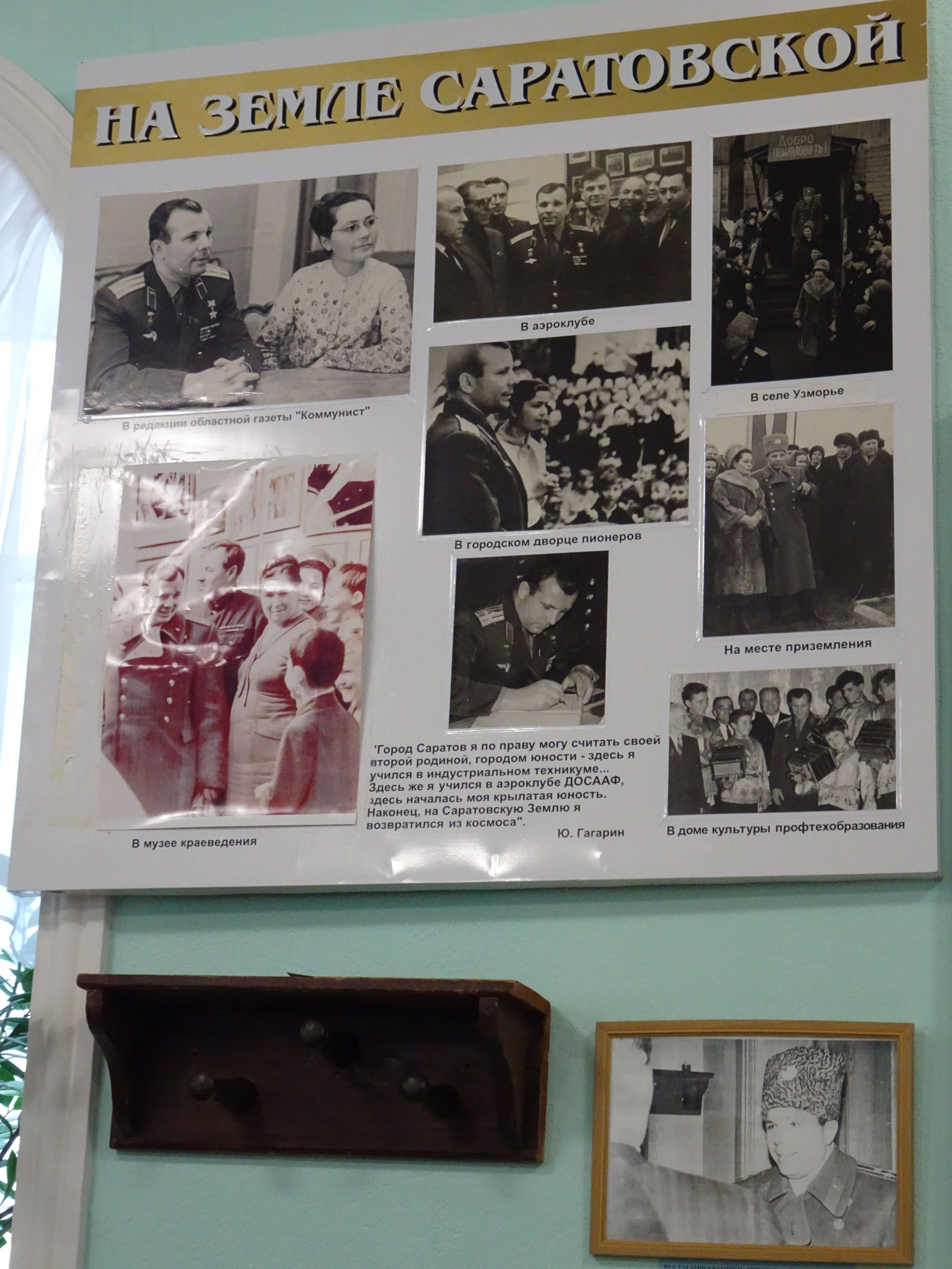 Работники архива убедились в том, что музей обладает бесценной коллекцией материалов, связанных с именем Ю.А. Гагарина. Она состоит из подлинных документов, фотографий, вещей, связанных с именем первого космонавта планеты. Прежде всего – это личное дело Юрия Гагарина, включающее в себя ряд документов, написанных его рукой, характеристику Гагарина, выписку из ведомости о его успеваемости и другие раритеты. В музее хранятся учебники, научно-популярные и художественные книги из библиотеки Саратовского индустриального техникума, которые читал Ю. Гагарин. В книги вложены формуляры, которые украшает подлинная роспись Гагарина. Среди экспонатов музея – подлинный судейский свисток Юрия Алексеевича, модель самолёта Як-18, отлитая Гагариным в подарок инструктору Саратовского аэроклуба, фрагмент обшивки самолёта, на котором первый космонавт совершил свой последний полёт вместе с лётчиком Серёгиным. Создателем и первым директором музея был заслуженный работник культуры РСФСР В.И. Россошанский, о чём гласит памятная мемориальная доска на здании музея.