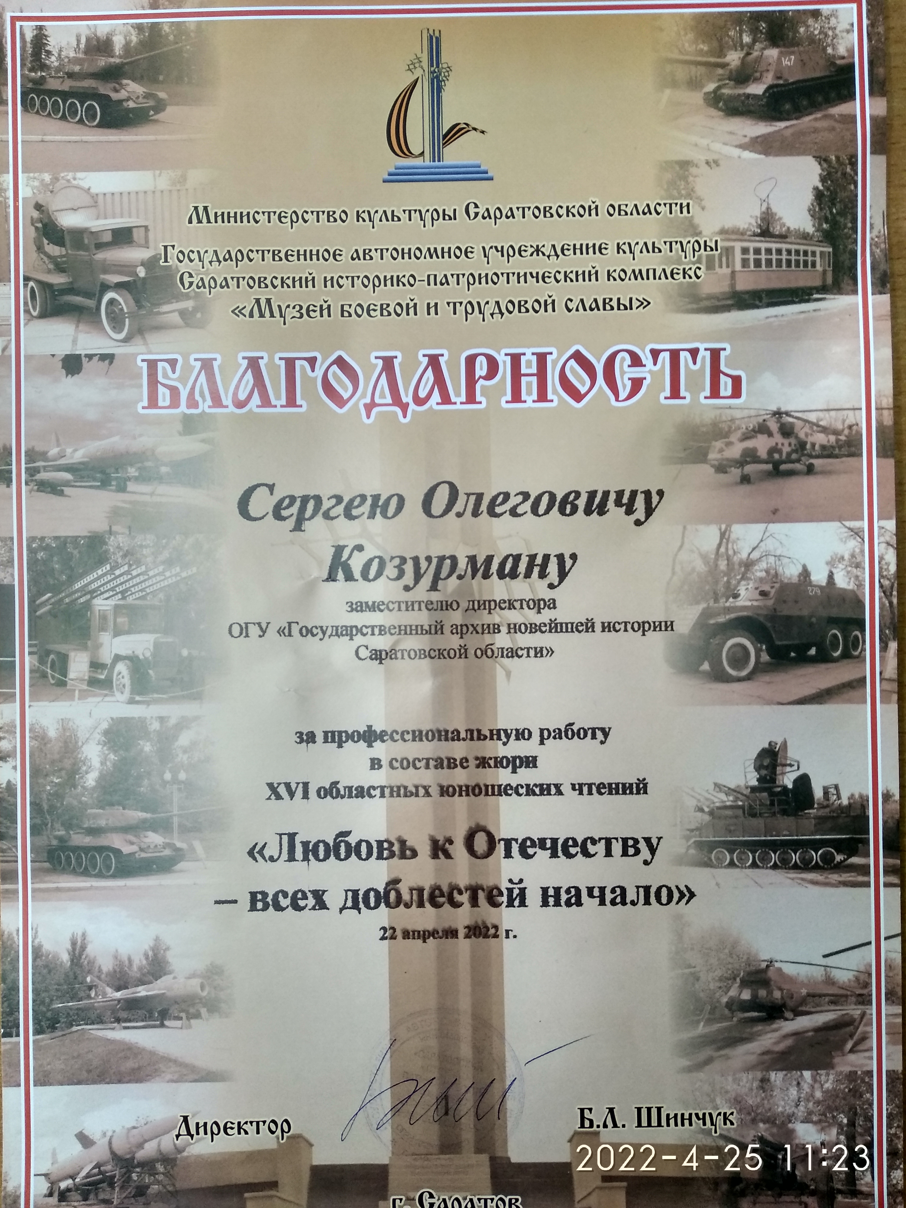 Кроме того, он рассказал о биографиях уроженцев Саратовской области, которые непосредственно участвовали в Сталинградской битве в 1942-1943 гг. Среди них: уроженец г. Саратова Герой Советского Союза лётчик-истребитель генерал-лейтенант Ерёмин Борис Николаевич; выпускник Саратовского бронетанкового училища 1942 г., Герой Советского Союза, командир экипажа тяжёлого танка гвардии лейтенант Малозёмов Иван Прокопьевич; уроженец села Чапушка Балашовского уезда, Герой Советского Союза гвардии красноармеец Каплунов Илья Макарович. Все они – отважные и смелые защитники Родины, которые проявили героизм при защите города на Волге.