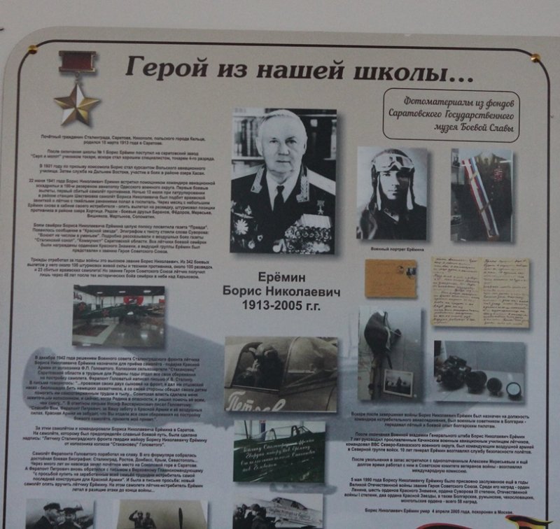 Б.Н.Ерёмин – участник Сталинградской битвы, тот самый лётчик, боевые самолеты которого, были куплены на Саратовском авиационном заводе колхозником-пчеловодом Ферапонтом Головатовым на свои личные сбережения. На истребителях Як-1 и Як-3 лётчик Б.Н. Ерёмин громил врага в воздушных боях. За период Великой Отечественной войны он совершил 342 боевых вылета. Провёл 70 воздушных боёв, сбил 23 самолёта противника.