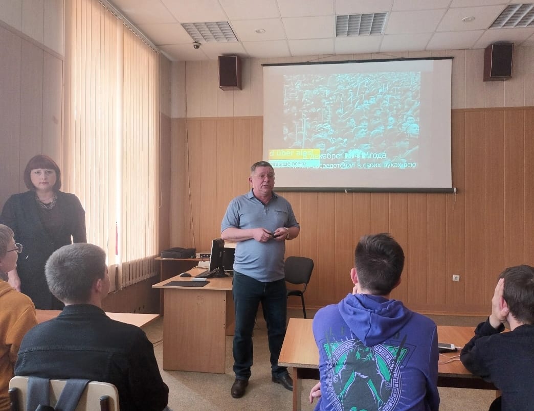 О службе в рядах Вооружённых Сил России рассказал ветеран Вооружённых Сил, участник боевых действий в Афганистане майор в отставке Лапин Владимир Петрович, сотрудник ОГУ ГАНИСО. Мероприятие прошло интересно, познавательно.