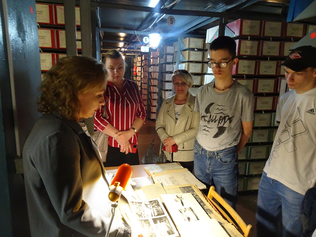 В одном из архивохранилищ с ними провела экскурсию начальник отдела использования и публикации документов Михейчик А.М., которая рассказала об условиях хранения и использования архивных документов. Показала интересные документы, альбомы, центральные и областные газеты времён Великой Отечественной войны, разные исторические фотографии.