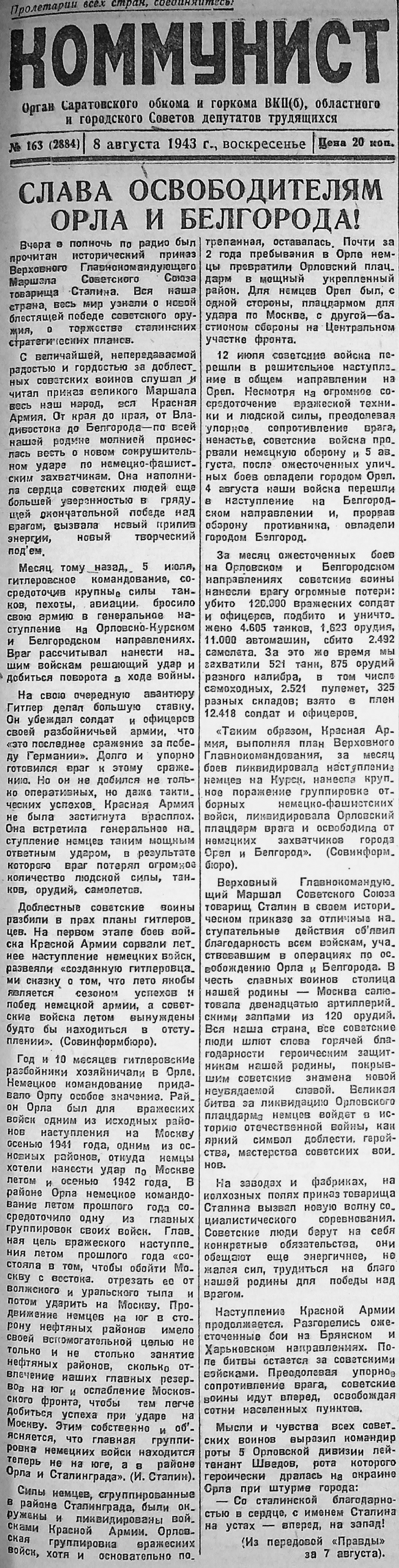 В Государственном архиве новейшей истории Саратовской области хранятся подшивки областной газеты «КОММУНИСТ» военных лет, в том числе и за 1943 год, в которых ярко оповещались все события, происходящие на фронтах Курской битвы.